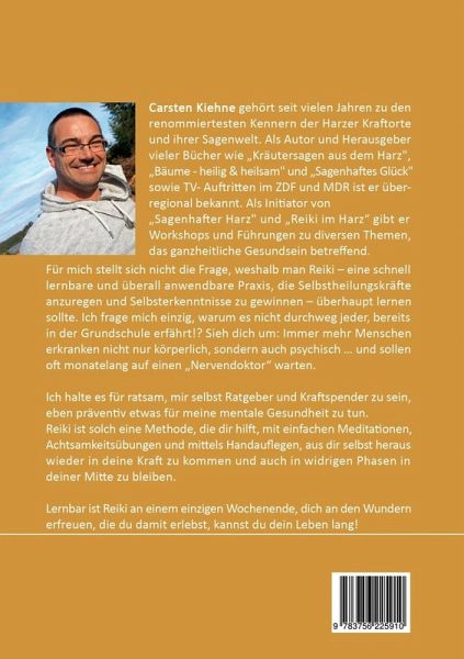Carsten Kiehne gehört seit vielen Jahren zu den renommiertesten Kennern der Harzer Kraftorte und ihrer Sagenwelt. Als Autor und Herausgeber vieler Bücher wie >Kräutersagen aus dem Harz<, >Bäume - heilig & heilsam< und >Sagenhaftes Glück< sowie TV- Auftritten im ZDF und MDR ist er überregional bekannt. Als Initiator von Sagenhafter Harz und Reiki im Harz gibt er Workshops und Führungen zu diversen Themen, das ganzheitliche Gesundsein betreffend.