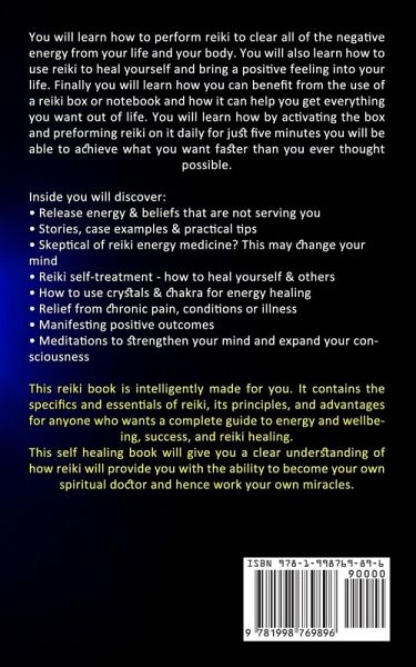 You will learn how to perform reiki to clear all of the negative energy from your life and your body. You will also learn how to use reiki to heal yourself and bring a positive feeling into your life. Finally you will learn how you can benefit from the use of a reiki box or notebook and how it can help you get everything you want out of life. You will learn how by activating the box and preforming reiki on it daily for just five minutes you will be able to achieve what you want faster than you ever thought possible. Inside you will discover:Release energy & beliefs that are not serving you Stories, case examples & practical tips Skeptical of reiki energy medicine? This may change your mind Reiki self-treatment - how to heal yourself & others How to use crystals & chakra for energy healing Relief from chronic pain, conditions or illness Manifesting positive outcomes Meditations to strengthen your mind and expand your consciousness This reiki book is intelligently made for you. It contains the specifics and essentials of reiki, its principles, and advantages for anyone who wants a complete guide to energy and wellbeing, success, and reiki healing. This self healing book will give you a clear understanding of how reiki will provide you with the ability to become your own spiritual doctor and hence work your own miracles.