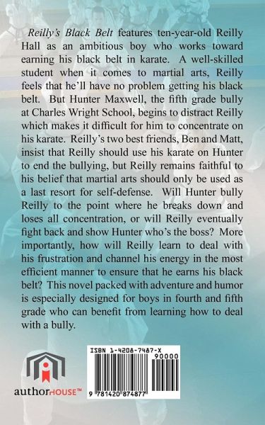 Reilly's Black Belt features ten-year-old Reilly Hall as an ambitious boy who works toward earning his black belt in karate. A well-skilled student when it comes to martial arts, Reilly feels that he'll have no problem getting his black belt. But Hunter Maxwell, the fifth grade bully at Charles Wright School, begins to distract Reilly which makes it difficult for him to concentrate on his karate. Reilly's two best friends, Ben and Matt, insist that Reilly should use his karate on Hunter to end the bullying, but Reilly remains faithful to his belief that martial arts should only be used as a last resort for self-defense. Will Hunter bully Reilly to the point where he breaks down and loses all concentration, or will Reilly eventually fight back and show Hunter who's the boss? More importantly, how will Reilly learn to deal with his frustration and channel his energy in the most efficient manner to ensure that he earns his black belt? This novel packed with adventure and humor is especially designed for boys in fourth and fifth grade who can benefit from learning how to deal with a bully.