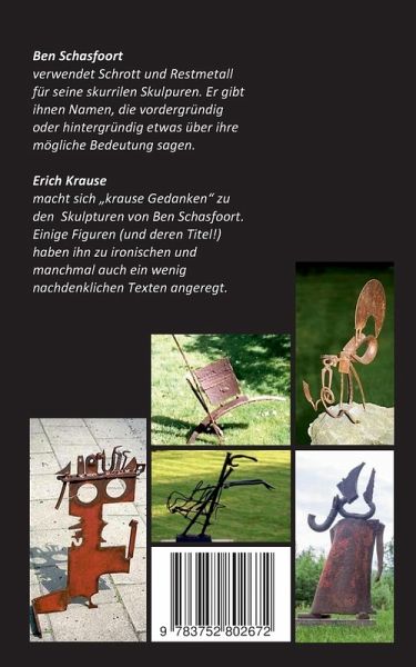 Von zwölf der skurrilen und meist mit subtilem Humor betitelten Skulpturen des niederländischen Künstlers Ben Schasfoort hat Erich Krause sich zu ironischen (und zum Teil auch nachdenklichen) Gedichten anregen lassen. Auf einer Doppelseite stehen sich jeweils das Foto einer Skulptur und ein Gedicht mit "krausen Gedanken" dazu gegenüber. Es ist sozusagen im wahrsten Sinne des Wortes der Versuch, sich einen Reim darauf zu machen. Da kommt unter anderem auch schon mal die mehr oder weniger ernst gemeinte Frage auf:"... ist die gestalt vielleicht nur eine täuschung, eine üble?hats seinen zweck dadurch erreichtdass ich darüber qualvoll grüble?"