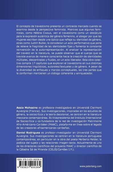 Obstáculo para la exposición del género femenino para unos (es básicamente el enfoque de feministas como Hélène Cixous (2010), quien exhorta a las mujeres a escribir "mostrando su género"), acto performativo para otros, el travestismo pretende revelar, siguiendo a la filósofa Judith Butler (2006), la fragilidad de las identidades fijas y el movimiento incesante de la autorrepresentación. Travestirse implica aceptar un mundo en metamorfosis donde el sujeto cruza las fronteras de género por voluntad propia. Por la manera en que se proyecta la figura del travesti en los textos literarios, es decir, en tanto que cuerpo transfigurado en metamorfosis, podemos notar que el cuerpo que se traviste evoluciona voluntariamente hacia la construcción de identidades plurales, descentradas y fluidas. El travestismo se torna, entonces, en una metamorfosis liberadora. Esta obra colectiva, a lo largo de sus 17 capítulos cuestiona el travestismo en sus diferentes acepciones lingüísticas, autorales/textuales y de género. Las tres partes que la componen se mantienen en diálogo, a pesar de la diversidad de sus enfoques y marcos conceptuales.