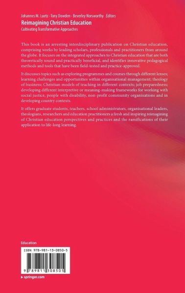This book is an arresting interdisciplinary publication on Christian education, comprising works by leading scholars, professionals and practitioners from around the globe. It focuses on the integrated approaches to Christian education that are both theoretically sound and practically beneficial, and identifies innovative pedagogical methods and tools that have been field-tested and practice-approved. It discusses topics such as exploring programmes and courses through different lenses; learning challenges and opportunities within organisational management; theology of business; Christian models of teaching in different contexts; job preparedness; developing different interpretive or meaning-making frameworks for working with social justice, people with disability, non-profit community organisations and in developing country contexts. It offers graduate students, teachers, school administrators, organisational leaders, theologians, researchers and education practitioners a fresh and inspiring reimagining of Christian education perspectives and practices and the ramifications of their application to life-long learning.