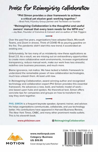 Winner: International Book Award, Business: Communications/Public Relations Microsoft Teams. Slack. Zoom. Google Workspace. Every day, hundreds of millions of people use these über-popular collaboration tools, but only in decidedly limited ways: as email and Skype replacements. Because these folks are merely scratching the surface of what these robust collaboration hubs can do, they fail to realize their massive benefits. Blame ignorance, not malice. With rare exception, organizations, executives, and rank-and-file employees have historically worked in piecemeal fashions. They have lacked a holistic framework to fully understand the remarkable power of these applications, much less unleash them. At least until now. Reimagining Collaboration-the eleventh book from award-winning author and world-renowned collaboration expert Phil Simon-provides this essential gestalt. Simon introduces a bold new model of work. Ideal for HR professionals, knowledge workers, executives, remote workers, and small business owners, this timely, ambitious, and provocative book offers concrete tips for companies and groups on how to transform the way they work by embracing hubs and spokes.