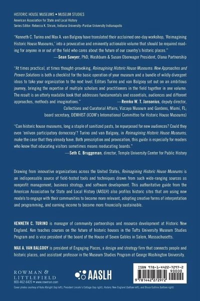 Since 2015, co-editors Kenneth C. Turino and Max A. van Balgooy have led the popular reinventing historic house workshop for the American Association for State and Local History. Kenneth C. Turino is Manager of Community Partnerships and Resource Development at Historic New England. He oversees community engagement projects throughout the New England states and is responsible for exhibition partnerships at the Eustis Estate, Langdon House, and Sarah Orne Jewett Museum and Visitor Center. He consults on interpretive planning and community engagement projects at historic sites, including Madame John's Legacy in New Orleans and the Palmer Warner House in Connecticut. Ken teaches courses on the future of historic houses in the Tufts University Museum Studies Program and is vice president of the board of the House of Seven Gables in Salem, Massachusetts. Max A. van Balgooy is president of Engaging Places, a design and strategy firm that connects people and historic places. For more than thirty years, he has worked with a wide range of historic sites on interpretive planning and business strategy, including Cliveden, Molly Brown House, Haas-Lilienthal House, James Madison's Montpelier, and Andrew Jackson's Hermitage. He is an assistant professor in the Museum Studies Program at George Washington University, directs the History Leadership Institute (formerly known as the Seminar for Historical Administration), and regularly leads workshops for the American Association for State and Local History.