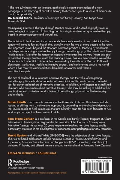 The individual client stories aim to paint each therapeutic meeting in such detail that the reader will come to feel as though they actually know the two or more people in the room. This approach moves beyond the standard narrative practice of teaching by transcripts and steps into teaching narrative therapy through autoethnography. The intention of these 'teaching tales' is to offer the reader an opportunity to enter into the very 'heart and soul' of narrative therapy practice, much like reading a novel has you enter into the lives of the characters that inhabit it. This work has been used by the authors in MA and PhD level classrooms, workshops, week-long intensive courses, and conferences around the world, where it has received commendations from both newcomer and veteran narrative therapists.