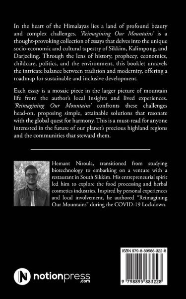 In the heart of the Himalayas lies a land of profound beauty and complex challenges. 'Reimagining Our Mountains' is a thought-provoking collection of essays that delves into the unique socio-economic and cultural tapestry of Sikkim, Kalimpong, and Darjeeling. Through the lens of history, prophecy, economics, childcare, politics, and the environment, this booklet unravels the intricate balance between tradition and modernity, offering a roadmap for sustainable and inclusive development. Each essay is a mosaic piece in the larger picture of mountain life from the author's local insights and lived experiences. 'Reimagining Our Mountains' confronts these challenges head-on, proposing simple, attainable solutions that resonate with the global quest for harmony. This is a must-read for anyone interested in the future of our planet's precious highland regions and the communities that steward them.