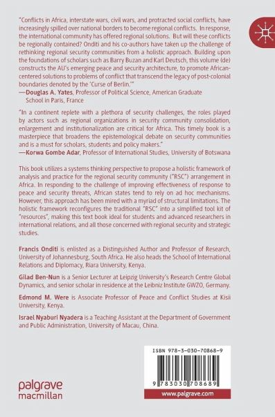 Chapter 1: Regional Security Community.- Chapter 2: Approaches to Regional Security Analysis.- Chapter 3: Regional Security Community Arrangement in Africa.- Chapter 4: African Peace and Security Architecture: Fit for Purpose?.- Chapter 5: Evolution of the African Standby Force.- Chapter 6: African Union-led Peace Support Operations.- Chapter 7: From Security Communities to Security Systems.- Chapter 8: Partnership in Peace Support Operations.- Chapter 9: Building Actors' Relationship through Concentric Rims.- Chapter 10: A Synchronic Dialogue and the Emerging Concept of Legal Security in Africa.- Chapter 11: How to Build Maritime Human Security Systems .- Chapter 12: Dominatarianism and Security Community Systems.
