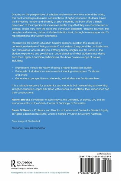 Drawing on the perspectives of scholars and researchers from around the world, this book challenges dominant constructions of higher education students. Given the increasing number and diversity of such students, the book offers a timely discussion of the implicit and sometimes subtle ways that they are characterised or defined. Topics vary from the ways that curriculum designers 'imagine' learners, the complex and evolving nature of student identity work, through to newspaper and TV representations of university attendees. Reimagining the Higher Education Student seeks to question the accepted or unquestioned nature of 'being a student' and instead foreground the contradictions and 'messiness' of such ideation. Offering timely insights into the nature of the student experience and providing an understanding of what students may desire from their Higher Education participation, this book covers a range of issues, including: Impressions versus the reality of being a Higher Education student Portrayals of students in various media including newspapers, TV shows and online Generational perspectives on students, and students as family members It is a valuable resource for academics and students both researching and working in higher education, especially those with a focus on identities, their importance and their constructions.