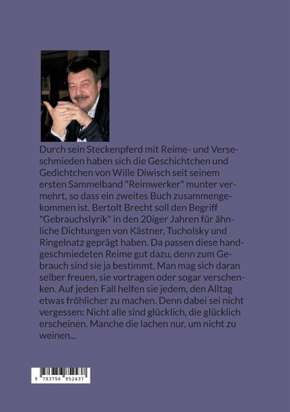 Durch sein Steckenpferd am Reime- und Verseschmieden haben sich die Geschichtchen ind Gedichtchen von WIlle Diwisch seit seinem ersten Sammelband "Reimwerker" munter vermehrt, so dass ein zweites Buch zusammengekommen ist. Man merkt ihnen den Spaß an, den er beim Reimen hat, denn seine Werke sind meistens zum Lachen oder Schmunzeln, aber auch mit Hintersinn oder mit einem unerwartetenSchluss.Bertolt Brecht soll den Begriff "Gebrauchslyrik" in den 20iger Jahren für ähnliche Dichtungen von Kästner, Tucholsky und RIngelnatz geprägt haben. Da passen diese handgeschmiedeten Reime gut dazu, denn zum Gebrauch sind sie ja bestimmt. Man mag sich daran selber freuen, sie vortragen oder sogar verschenken. Auf jeden Fall helfen sie jedem, den Alltag etwas fröhlicher zu machen. Denn dabei sei nicht vergessen: Nicht alle sind glücklich, die glücklich erscheinen. Manche die lachen nur, um nicht zu weinen...