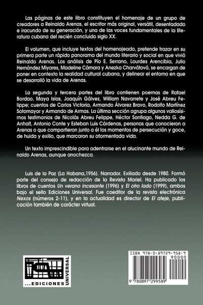 Reinaldo Arenas nació en Holguín, Oriente, Cuba en 1943. El 7 de diciembre de 1990 puso fin a su vida, responsabilizando a Fidel Castro de su decisión, en carta testamento que escribió. Es considerado uno de los mejores escritores cubanos del siglo XX. Las páginas de este libro constituyen el homenaje de un grupo de creadores a Reinaldo Arenas, el escritor más original, versátil, desenfadado e iracundo de su generación. Con escritos sobre Reinaldo Arenas, su vida y su obra, de Luis de la PazJoaquín Gálvez, William Navarrete, José Abreu, Pío Serrano, Lourdes Arencibia, Julio Hernández Miyares, Carlos Victoria, Rodolfo Martínez Sotomayor, Armando de Armas, Nicolás Abreu, Héctor Santiago, Nedda F. De Anhalt, Antonio Conte y Esteban Luis Cárdenas. Un libro imprescindible para adentrarse en el alucinante mundo de Reinaldo Arenas, aunque anochezca. *** Reinaldo Arenas was born in Holguín, Oriente, Cuba in 1943. On December 7, 1990, he ended his life and in a letter he left behind, he held Fidel Castro responsible for this final decision. He is considered one of the best Cuban writers of the twentieth century. The pages of this book constitute the tribute of a group of creators to Reinaldo Arenas, the most original, versatile, carefree and angry writer of his generation. With writings about Reinaldo Arenas, his life and his work by Luis de la Paz, Joaquín Gálvez, William Navarrete, José Abreu, Pío Serrano, Lourdes Arencibia, Julio Hernández Miyares, Carlos Victoria, Rodolfo Martínez Sotomayor, Armando de Armas, Nicolás Abreu, Héctor Santiago, Nedda F. De Anhalt, Antonio Conte y Esteban Luis Cárdenas. An essential book to enter the amazing world of Reinaldo Arenas, even if it gets dark.