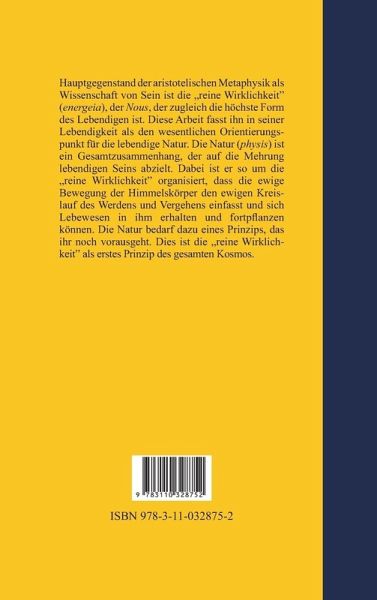 Hauptgegenstand der aristotelischen Metaphysik als Wissenschaft von Sein ist die "reine Wirklichkeit" (energeia), der Nous, der zugleich die höchste Form des Lebendigen ist. Diese Arbeit fasst ihn in seiner Lebendigkeit als den wesentlichen Orientierungspunkt für die lebendige Natur. Die Natur (physis) ist ein Gesamtzusammenhang, der auf die Mehrung lebendigen Seins abzielt. Dabei ist er so um die "reine Wirklichkeit" organisiert, dass die ewige Bewegung der Himmelskörper den ewigen Kreislauf des Werdens und Vergehens einfasst und sich Lebewesen in ihm erhalten und fortpflanzen können. Die Natur bedarf dazu eines Prinzips, das ihr noch vorausgeht. Dies ist die "reine Wirklichkeit" als erstes Prinzip des gesamten Kosmos.