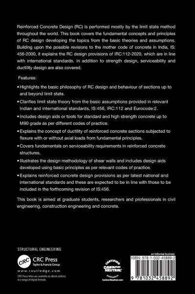 Highlights the basic philosophy of RC design and behaviour of the sections up to and beyond limit state.Clarifies limit state theory from the basic assumptions provided in relevant Indian and international standards, IS:456, IRC:112 and Eurocode:2.Includes design aids or tools for standard and high strength concrete up to M90 grade as per different codes of practice.Explains the concept of ductility of reinforced concrete sections subjected to flexure with or without axial loads from fundamental principles.Covers fundamentals on serviceability requirements in reinforced concrete structures.Illustrates the design methodology of shear walls and includes design aids developed using basic principles as per relevant codes of practice.Explains reinforced concrete design provisions as per latest national and international standards and these are expected to be in line with those to be included in the forthcoming revision of IS:456.