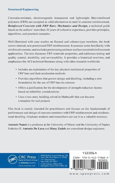 Corrosion-resistant, electromagnetic transparent and lightweight fiber-reinforced polymers (FRPs) are accepted as valid alternatives to steel in concrete reinforcement. Reinforced Concrete with FRP Bars: Mechanics and Design, a technical guide based on the authors' more than 30 years of collective experience, provides principles, algorithms, and practical examples. Well-illustrated with case studies on flexural and column-type members, the book covers internal, non-prestressed FRP reinforcement. It assumes some familiarity with reinforced concrete, and excludes prestressing and near-surface mounted reinforcement applications. The text discusses FRP materials properties, and addresses testing and quality control, durability, and serviceability. It provides a historical overview, and emphasizes the ACI technical literature along with other research worldwide. Includes an explanation of the key physical mechanical properties of FRP bars and their production methods Provides algorithms that govern design and detailing, including a new formulation for the use of FRP bars in columns Offers a justification for the development of strength reduction factors based on reliability considerations Uses a two -story building solved in Mathcad® that can become a template for real projects This book is mainly intended for practitioners and focuses on the fundamentals of performance and design of concrete members with FRP reinforcement and reinforcement detailing. Graduate students and researchers can use it as a valuable resource. Antonio Nanni is a professor at the University of Miami and the University of Naples Federico II. Antonio De Luca and Hany Zadeh are consultant design engineers.