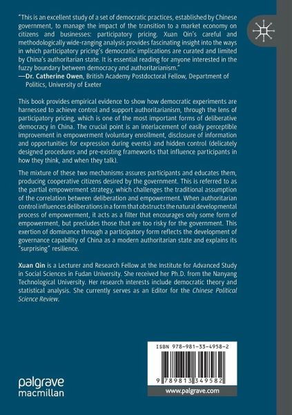 This book provides empirical evidence to show how democratic experiments are harnessed to achieve control and support authoritarianism, through the lens of participatory pricing, which is one of the most important forms of deliberative democracy in China. The crucial point is an interlacement of easily perceptible improvement in empowerment (voluntary enrollment, disclosure of information and opportunities for expression during events) and hidden control (delicately designed procedures and pre-existing frameworks that influence participants in how they think, and when they talk).