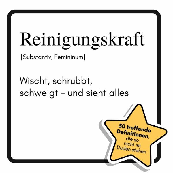 Wer wirklich wissen will, was nachts in Bürofluren, Hotelfoyers und Pausenräumen passiert, sollte einen Blick hinter den Wischmopp werfen: "Reinigungskraft: Wischt, schrubbt, schweigt - und sieht alles" enthüllt mit spitzer Feder und scharfem Blick die geheime Welt der Sauberkeit. 50 Begriffe aus dem Alltag der Reinigungskräfte werden hier so humorvoll und treffend definiert, dass selbst der Schmutz vor Lachen vergeht - und jede Illustration bringt die kleinen Dramen des Putzalltags auf den Punkt.Für wen dieses Buch perfekt ist:- Für alle, die den Alltag von Reinigungskräften mit einem Augenzwinkern betrachten wollen- Für Fans von skurrilem Humor und liebevollen Alltagsbeobachtungen- Für Menschen, die das Unsichtbare sichtbar machen möchtenEin Geschenk für alle, die wissen: Hinter jeder glänzenden Oberfläche steckt eine Geschichte. "Reinigungskraft: Wischt, schrubbt, schweigt - und sieht alles" bringt sie ans Licht.Was dieses Buch bietet:- 50 witzige Definitionen rund um den Putzalltag- Passende Illustrationen zu jedem Begriff- Einblicke in die Welt hinter den Kulissen- Perfekt als Geschenk für Kolleginnen, Kollegen und Alltagshelden