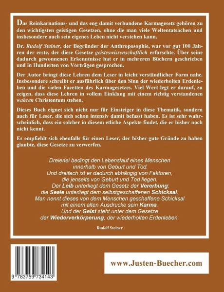 Das Reinkarnations- und das eng damit verbundene Karmagesetz gehören zu den wichtigsten geistigen Gesetzen, ohne die man viele Weltentatsachen und insbesondere auch sein eigenes Leben nicht verstehen kann.Dr. Rudolf Steiner, der Begründer der Anthroposophie, war vor gut 100 Jahren der erste, der diese Gesetze geisteswissenschaftlich erforschte. Über seine dadurch gewonnenen Erkenntnisse hat er in mehreren Büchern geschrieben und in Hunderten von Vorträgen gesprochen.Der Autor bringt diese Lehren dem Leser in leicht verständlicher Form nahe. Insbesondere schreibt er ausführlich über den Sinn der wiederholten Erdenleben und die vielen Facetten des Karmagesetzes. Viel Wert legt er darauf, zu zeigen, dass diese Lehren in vollem Einklang mit einem richtig verstandenen wahren Christentum stehen. Dieses Buch eignet sich nicht nur für Einsteiger in diese Thematik, sondern auch für Leser, die sich schon intensiv damit befasst haben. Es ist sehr wahrscheinlich, dass ein solcher in diesem etliche Aspekte findet, die er bisher noch nicht kennt.Es empfiehlt sich ebenfalls für einen Leser, der bisher gute Gründe zu haben glaubte, diese Gesetze zu verwerfen. Dreierlei bedingt den Lebenslauf eines Menschen innerhalb von Geburt und Tod. Und dreifach ist er dadurch abhängig von Faktoren, die jenseits von Geburt und Tod liegen. Der Leib unterliegt dem Gesetz der Vererbung; die Seele unterliegt dem selbstgeschaffenen Schicksal. Man nennt dieses von dem Menschen geschaffene Schicksal mit einem alten Ausdrucke sein Karma. Und der Geist steht unter dem Gesetze der Wiederverkörperung, der wiederholten Erdenleben. Rudolf Steiner