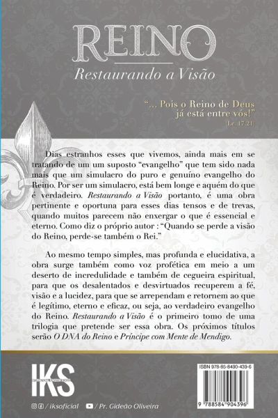 **Reino: Restaurando a Visão - Vol. 1** **Transforme sua vida espiritual e sua igreja com a restauracao visão do Reino de Deus!** Em **"Reino: Restaurando a Visão - Vol. 1"**, Gideão Oliveira convida você a redescobrir os fundamentos do Reino de Deus e a restaurar a visão original que Cristo trouxe ao mundo. Este livro oferece uma análise profunda e crítica dos desafios enfrentados pela igreja moderna, destacando a necessidade urgente de um avivamento espiritual genuíno. **Por que ler este livro?** - **Relevância Universal:** As questões abordadas são comuns a igrejas de todo o mundo, tornando esta leitura indispensável para qualquer cristão que deseja crescer espiritualmente. - **Guia Prático:** Gideão Oliveira oferece soluções práticas e bíblicas para problemas contemporâneos da igreja, ajudando líderes e membros a viverem uma fé mais autêntica e poderosa. - **Experiência e Autoridade:** Com vasta experiência ministerial, o autor compartilha insights valiosos de sua jornada por diferentes países, oferecendo uma perspectiva global sobre os desafios e soluções para a igreja atual. **Palavras-Chave:** Reino de Deus; Igreja; Restauração Espiritual; Liderança Cristã; Evangelho; Moral Cristã; Avivamento; Humanismo na Igreja; Pregação Profética; Profetas de Aluguel; Decadência Espiritual; Transformação Espiritual; Ministério Profético; Rebeldia na Igreja; Cultura do Reino. **O que você encontrará neste livro?** - Uma análise detalhada sobre a **decadência da igreja atual** e as causas desta crise espiritual. - Discussões sobre o impacto do **humanismo na igreja** e a necessidade de se voltar aos ensinamentos de Cristo. - Reflexões sobre o **culto ao ego** e como ele tem distorcido a verdadeira adoração. - Exposições sobre **profetas de aluguel** e a importância de uma liderança genuína e comprometida com o Reino de Deus. - Um chamado à **restauração da pregação como voz profética**, essencial para o avivamento espiritual. **Adquira seu exemplar hoje mesmo e comece sua jornada de restauracao espiritual!**