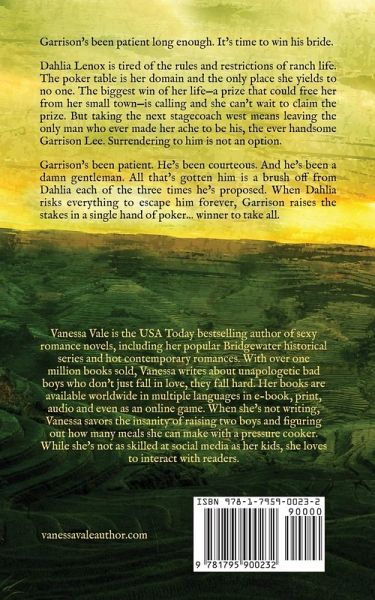 Garrison's been patient long enough. It's time to win his bride. Dahlia Lenox is tired of the rules and restrictions of ranch life. The poker table is her domain and the only place she yields to no one. The biggest win of her life-a prize that could free her from her small town-is calling and she can't wait to claim the prize. But taking the next stagecoach west means leaving the only man who ever made her ache to be his, the ever handsome Garrison Lee. Surrendering to him is not an option. Garrison's been patient. He's been courteous. And he's been a damn gentleman. All that's gotten him is a brush off from Dahlia each of the three times he's proposed. When Dahlia risks everything to escape him forever, Garrison raises the stakes in a single hand of poker... winner to take all. Don't miss the third book in the Lenox Ranch Cowboys series with a daring heroine and obsessed alpha cowboy determined to make her his. This book was previously published as Dahlia in the Wildflower Brides series.