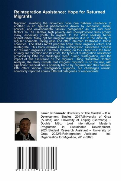 Migration, involving the movement from one habitual residence to another, is an age-old phenomenon driven by economic, social, political, and environmental factors, categorized as pull and push factors. In The Gambia, high poverty and unemployment rates prompt many, especially youth, to migrate to the West seeking better opportunities. Many opt for irregular migration due to the difficulty of regular channels, facing risks and often inhuman treatment in transit countries. The IOM's AVRR program helps these migrants return and reintegrate. This book examines the reintegration assistance process for returned migrants in Gambia, focusing on four objectives: the trend of irregular migration and its costs, the types of reintegration assistance provided by IOM, the challenges faced during reintegration, and the impact of this assistance on the migrants. Using Qualitative Content Analysis, the study reveals that irregular migration is on the rise, with significant financial costs primarily borne by migrants and their families. IOM offers various reintegration supports, but challenges remain, commonly reported across different categories of respondents.