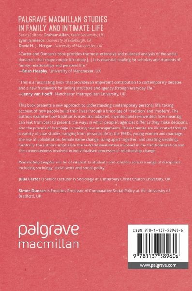 This book presents a new approach to understanding contemporary personal life, taking account of how people build their lives through a bricolage of 'tradition' and 'modern'. The authors examine how tradition is used and adapted, invented and re-invented; how meaning can leak from past to present; the ways in which people's agencies differ as they make decisions; and the process of bricolage in making new arrangements. These themes are illustrated through a variety of case studies, ranging from personal life in the 1950s, young women and marriage, the rise of cohabitation, female name change, living apart together, and creating weddings. Centrally the authors emphasise the re-traditionalisation involved in de-traditionalisation and the connectedness involved in individualised processes of relationship change.