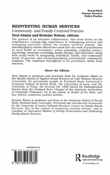 Introduction; I: The Context of Community- and Family-Centered Practice; 1: Neighborhood-Based Services in Low-Income Neighborhoods: A Brief History; 2: The Economic Context of Community-Centered Practice: Markets, Communities, and Social Policy; 3: Integrating Community and Individual Practice: A New Paradigm for Practice; II: Creating Community- and Family-Centered Practice: Examples from the Social Services, Education, and Policing; 4: Working with Families and Communities: The Patch Approach; 5: Family-Centered Social Services: Moving Toward System Change; 6: Self-Employment Training and Family Development: An Integrated Strategy for Family Empowerment; 7: School-Based Comprehensive Services: An Example of Interagency Collaboration; 8: Linking Schools with Family- and Community-Centered Services; 9: Community Policing: The Police as a Community Resource; 10: Young People as Community Resources: New Forms of Participation; III: Changing Practice to Include Families and Communities; 11: Understanding and Constructing Community: A Communication Approach; 12: Professional Understandings of Community: At a Loss for Words?; 13: Expanding the Focus of Intervention: The Importance of Family/Community Relations; 14: Strengthening Partnerships between Families and Service Providers