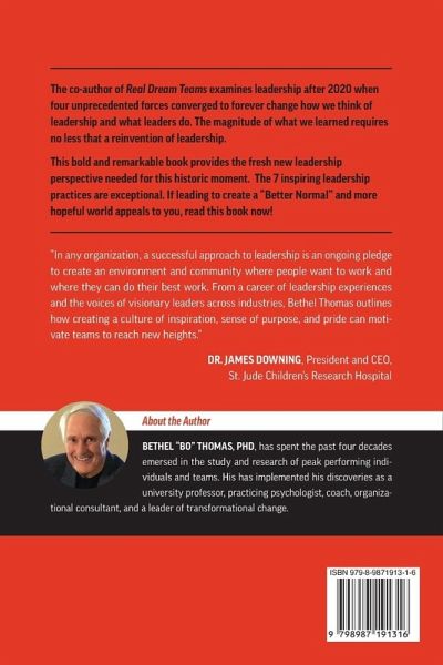 From the co-author of Real Dream Teams, this bold and refreshing new book explodes with a new perspective on leadership and the practices that inspire peak performance. Now available in paperback and a great Christmas gift for anyone you care about, this book is the perfect gift for this historic moment when everyone is called to find their voice and lead. Thomas argues that current leadership practices are broken and getting "back to normal" leadership is not an option after 2020. In a compelling and convincing manner, we learn that traditional bureaucratic management models are inadequate and uninspiring, and toxic leaders are dangerous, attempting to normalize unethical, destructive, mean-spirited, and dehumanizing behaviors. Leadership is in crisis and poses a threat to organizations, communities, and the country. The magnitude of the threat, however, provides the greatest leadership opportunity of our lifetime, an opportunity for anyone and everyone to step up and be a leader, an inspirer, a difference-maker, a hope-giver, and help create a "Better Normal". Bethel, well-known as Bo, has been a student and teacher of what inspires peak individual and team performance for over 4 decades. His intense study and research findings have been implemented as a university professor, practicing psychologist, coach, organizational consultant, author, and transformative leader. He has examined the leadership elephant from head to tail and is perfectly positioned to write about leadership after 2020 when four unprecedented forces emerged at the same time to forever change leadership and what leaders do. We now know that all people can lead, that the best thinking and acting of all people is urgent for innovative and creative solutions, and we know the 7 exceptional leadership practices that create cultures of inspiration. Inspiring leaders and inspired people consistently outperform those who work in traditional bureaucratic organizations. Reinventing Leadership is the book for anyone who wants to make a bigger difference with their life, attain personal or organizational dreams, and help make the people and the environment around them better. If you are genuinely interested in leadership, read this book now!