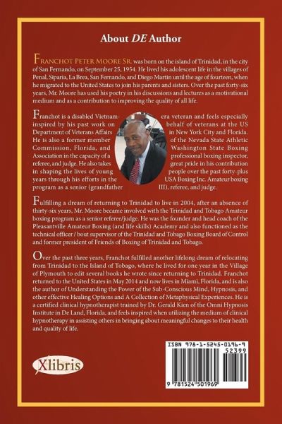 Franchot Peter Moore Sr. was born on the island of Trinidad, in the city of San Fernando, on September 25, 1954. He lived his adolescent life in the villages of Penal, Siparia, La Brea, San Fernando, and Diego Martin until the age of fourteen, when he migrated to the United States to join his parents and sisters. Over the past forty-six years, Mr. Moore has used his poetry in his discussions and lectures as a motivational medium and as a contribution to improving the quality of all life. Franchot is a disabled Vietnam-era veteran and feels especially inspired by his past work on behalf of veterans at the US Department of Veterans Affairs in New York City and Florida. He is also a former member of the Nevada State Athletic Commission, Florida, and Washington State Boxing Association in the capacity of a professional boxing inspector, referee, and judge. He also takes great pride in his contribution in shaping the lives of young people over the past forty-plus years through his efforts in the USA Boxing Inc. Amateur boxing program as a senior (grandfather III), referee, and judge. Fulfilling a dream of returning to Trinidad to live in 2004, after an absence of thirty-six years, Mr. Moore became involved with the Trinidad and Tobago Amateur boxing program as a senior referee/judge. He was the founder and head coach of the Pleasantville Amateur Boxing (and life skills) Academy and also functioned as the technical officer / bout supervisor of the Trinidad and Tobago Boxing Board of Control and former president of Friends of Boxing of Trinidad and Tobago. Over the past three years, Franchot fulfilled another lifelong dream of relocating from Trinidad to the Island of Tobago, where he lived for one year in the Village of Plymouth to edit several books he wrote since returning to Trinidad. Franchot returned to the United States in May 2014 and now lives in Miami, Florida, and is also the author of Understanding the Power of the Sub-Conscious Mind, Hypnosis, and other effective Healing Options and A Collection of Metaphysical Experiences. He is a certified clinical hypnotherapist trained by Dr. Gerald Kien of the Omni Hypnosis Institute in De Land, Florida, and feels inspired when utilizing the medium of clinical hypnotherapy in assisting others in bringing about meaningful changes to their health and quality of life.