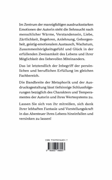 Im Zentrum der mannigfaltigen ausdrucksstarken Emotionen der Autorin steht die Sehnsucht nach menschlicher Wärme, Verstandensein, Liebe, Zärtlichkeit, Begehren, Anlehnung, Geborgenheit, geistig-emotionalem Austausch, Wachstum, Zusammengehörigkeitsgefühl und Glück in der erfüllenden Zweisamkeit des Lebens und ihrer Möglichkeit des liebevollen Miteinanders.Das ist letztendlich der Inbegriff der persönlichen und beruflichen Erfüllung im gleichen Fachbereich Musik.Die Bandbreite der Metaphorik und der Ausdrucksgestaltung lässt tiefsinnige Schlussfolgerungen bezüglich des Charakters und Temperamentes der Autorin und ihres Wertesystems zu.Lassen Sie sich von ihr mitreißen, sich dank ihrer lebhaften Fantasie und Vorstellungskraft in das Abenteuer ihres Lebens hineinfallen und versinken zu lassen!