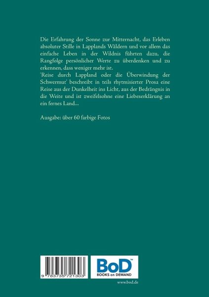 Die Erfahrung der Sonne zur Mitternacht, das Erleben absoluter Stille in Lapplands Wäldern und vor allem das einfache Leben in der Wildnis führten dazu, die Rangfolge persönlicher Werte zu überdenken und zu erkennen, dass weniger mehr ist.'Reise durch Lappland oder die Überwindung der Schwermut' beschreibt in teils rhythmisierter Prosa eine Reise aus der Dunkelheit ins Licht, aus der Bedrängnis in die Weite und ist zweifelsohne eine Liebeserklärung an ein fernes Land...Ausgabe: über 60 farbige Fotos