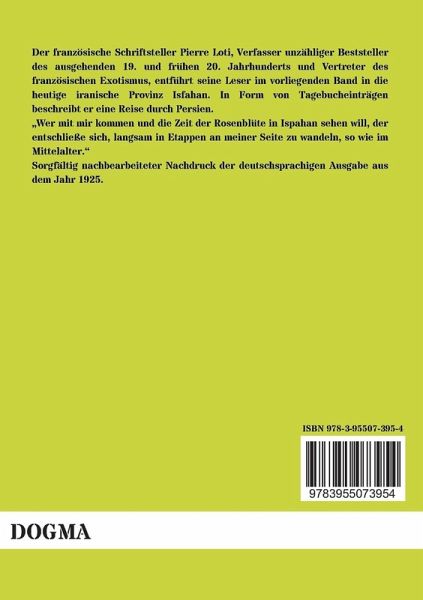 Der französische Schriftsteller Pierre Loti, Verfasser unzähliger Beststeller des ausgehenden 19. und frühen 20. Jahrhunderts und Vertreter des französischen Exotismus, entführt seine Leser im vorliegenden Band in die heutige iranische Provinz Isfahan. In Form von Tagebucheinträgen beschreibt er eine Reise durch Persien. Wer mit mir kommen und die Zeit der Rosenblüte in Ispahan sehen will, der entschließe sich, langsam in Etappen an meiner Seite zu wandeln, so wie im Mittelalter.