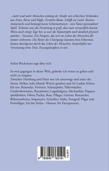 .mehr und mehr Menschen entlang der Straße mit schlechten Verbänden um Arme, Beine und Köpfe. Zerstörte Boote, Schiffe an Land. Ruinen, Autowracks und herausgerissene Schienentrassen - von Natur gewundener Stahl. Teilweise war die Zerstörung so groß, dass man verzweifeln konnte. Wenn auch einige Tage her, so war die Katastrophe noch deutlich physisch spürbar - Tsunami. Ein Ereignis, das sich im Leben der Menschen für immer einbrennt. Die Reiter des Untergangs kannten kein Erbarmen, kamen durchgerast durch das Leben der Menschen, hinterließen nur Verwüstung ohne Trost. Fassungslosigkeit in mir.Diese 2. überarbeitete Auflage enthält erstmals zwanzig Farbfotografien.