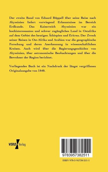 Der zweite Band von Eduard Rüppell über seine Reise nach Abyssinien liefert vorwiegend Erkenntnisse im Bereich Erdkunde. Das Kaiserreich Abyssinien war ein hochinteressantes und schwer zugängliches Land in Ostafrika auf dem Gebiet des heutigen Äthiopien und Eritrea. Der Zweck seiner Reisen in Ost-Afrika und Arabien war die geographische Forschung und deren Anerkennung in wissenschaftlichen Kreisen. Auch wird über die Regierungsgeschichte von Abyssinien, über astronomische Beobachtungen und über die Bewohner der Region berichtet.