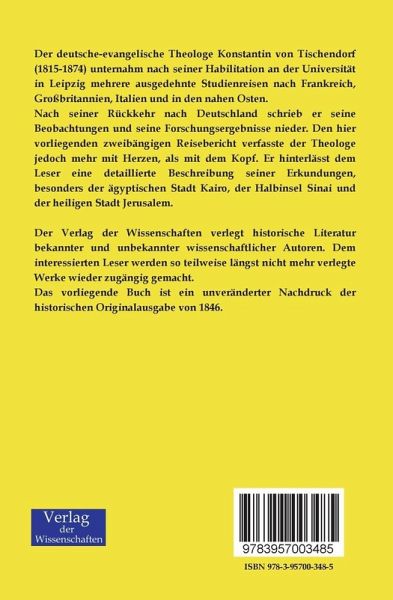Der deutsche-evangelische Theologe Konstantin von Tischendorf (1815-1874) unternahm nach seiner Habilitation an der Universität in Leipzig mehrere ausgedehnte Studienreisen nach Frankreich, Großbritannien, Italien und in den nahen Osten. Nach seiner Rückkehr nach Deutschland schrieb er seine Beobachtungen und seine Forschungsergebnisse nieder. Den hier vorliegenden zweibängigen Reisebericht verfasste der Theologe jedoch mehr mit Herzen, als mit dem Kopf. Er hinterlässt dem Leser eine detaillierte Beschreibung seiner Erkundungen, besonders der ägyptischen Stadt Kairo, der Halbinsel Sinai und…mehr