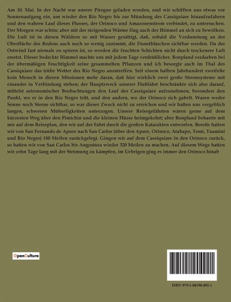 Am 10. Mai. In der Nacht war unsere Pirogue geladen worden, und wir schifften uns etwas vor Sonnenaufgang ein, um wieder den Rio Negro bis zur Mündung des Cassiquiare hinaufzufahren und den wahren Lauf dieses Flusses, der Orinoco und Amazonenstrom verbindet, zu untersuchen. Der Morgen war schön; aber mit der steigenden Wärme fing auch der Himmel an sich zu bewölken. Die Luft ist in diesen Wäldern so mit Wasser gesättigt, daß, sobald die Verdunstung an der Oberfläche des Bodens auch noch so wenig zunimmt, die Dunstbläschen sichtbar werden. Da der Ostwind fast niemals zu spüren ist, so werden die feuchten Schichten nicht durch trockenere Luft ersetzt. Dieser bedeckte Himmel machte uns mit jedem Tage verdrüßlicher. Bonpland verdarben bei der übermäßigen Feuchtigkeit seine gesammelten Pflanzen und ich besorgte auch im Thal des Cassiquiare das trübe Wetter des Rio Negro anzutreffen. Seit einem halben Jahrhundert zweifelte kein Mensch in diesen Missionen mehr daran, daß hier wirklich zwei große Stromsysteme mit einander in Verbindung stehen; der Hauptzweck unserer Flußfahrt beschränkte sich also darauf, mittelst astronomischer Beobachtungen den Lauf des Cassiquiare aufzunehmen, besonders den Punkt, wo er in den Rio Negro tritt, und den andern, wo der Orinoco sich gabelt. Waren weder Sonne noch Sterne sichtbar, so war dieser Zweck nicht zu erreichen und wir hatten uns vergeblich langen, schweren Mühseligkeiten unterzogen. Unsere Reisegefährten wären gerne auf dem kürzesten Weg über den Pimichin und die kleinen Flüsse heimgekehrt; aber Bonpland beharrte mit mir auf dem Reiseplan, den wir auf der Fahrt durch die großen Katarakten entworfen. Bereits hatten wir von San Fernando de Apure nach San Carlos (über den Apure, Orinoco, Atabapo, Temi, Tuamini und Rio Negro) 180 Meilen zurückgelegt. Gingen wir auf dem Cassiquiare in den Orinoco zurück, so hatten wir von San Carlos bis Angostura wieder 320 Meilen zu machen. Auf diesem Wege hatten wir zehn Tage lang mit der Strömung zu kämpfen, im Uebrigen ging es immer den Orinoco hinab
