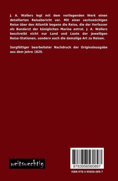 J. A. Wallers legt mit dem vorliegenden Werk einen detallierten Reisebericht vor. Mit einer sechswöchigen Reise über den Atlantik begann die Reise, die der Verfasser als Bundarzt der königlichen Marine antrat. J. A. Wallers beschreibt nicht nur Land und Leute der jeweiligen Reise-Stationen, sondern auch die damalige Art zu Reisen.