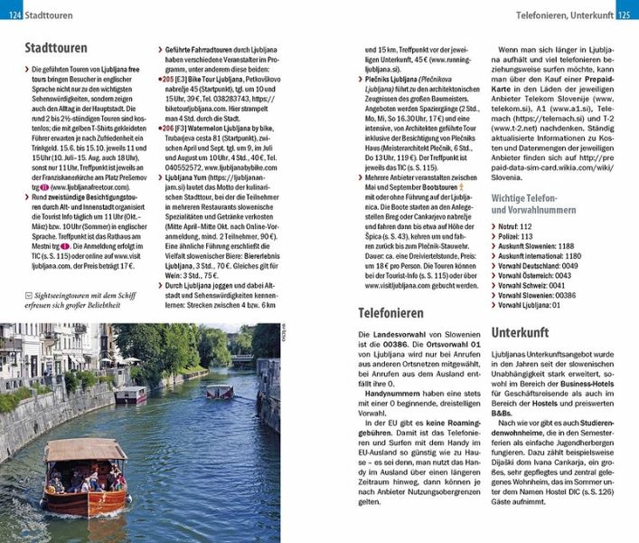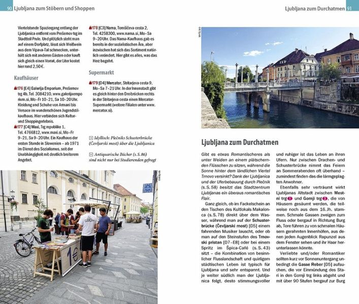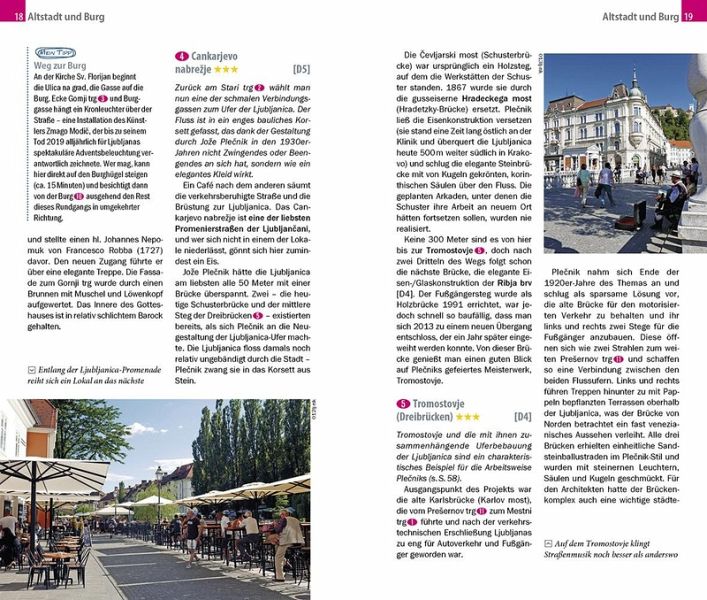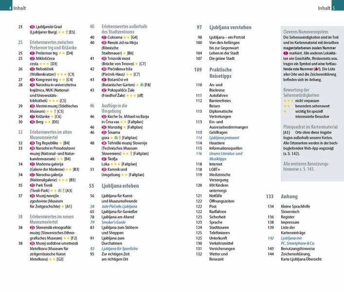 Dazu: kostenlose Web-App für Smartphone, Tablet und PC mit Stadtplan- und Satellitenansichten passend zum Text, Routenführung zu allen beschriebenen Sehenswürdigkeiten, Verlauf des Stadtspaziergangs, seitenbezogenen Updates nach Redaktionsschluss sowie einem Mini-Audiotrainer Slowenisch