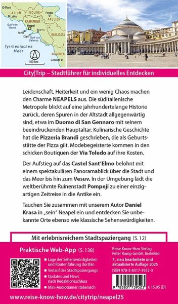 Dazu: kostenlose Web-App für Smartphone, Tablet und PC mit Stadtplan- und Satellitenansichten passend zum Text, Routenführung zu allen beschriebenen Sehenswürdigkeiten, Verlauf der Stadtspaziergänge, seitenbezogenen Updates nach Redaktionsschluss sowie einem Mini-Audiotrainer Italienisch