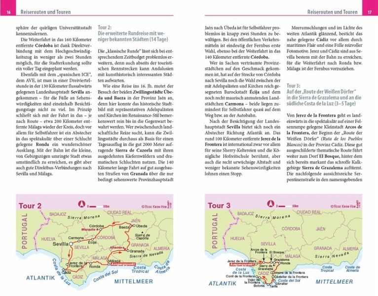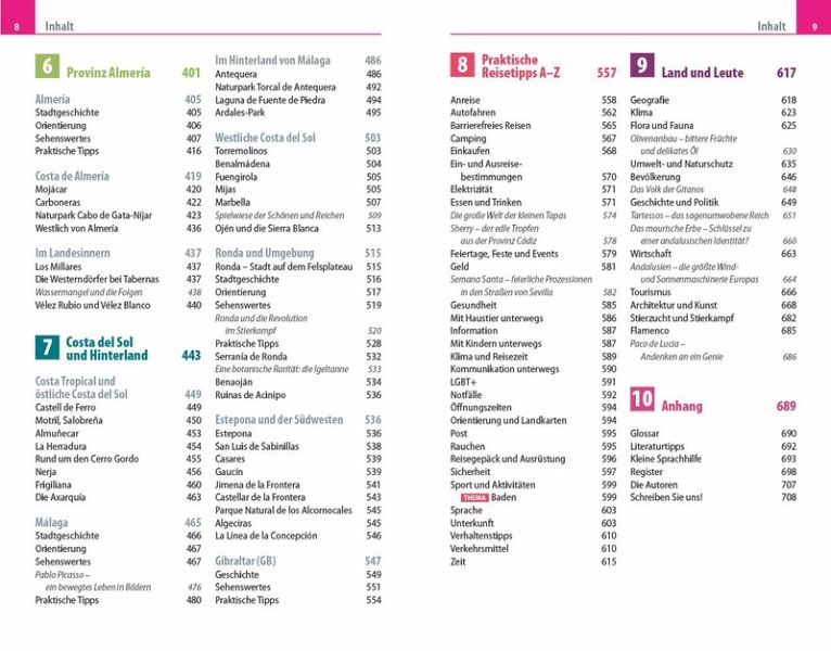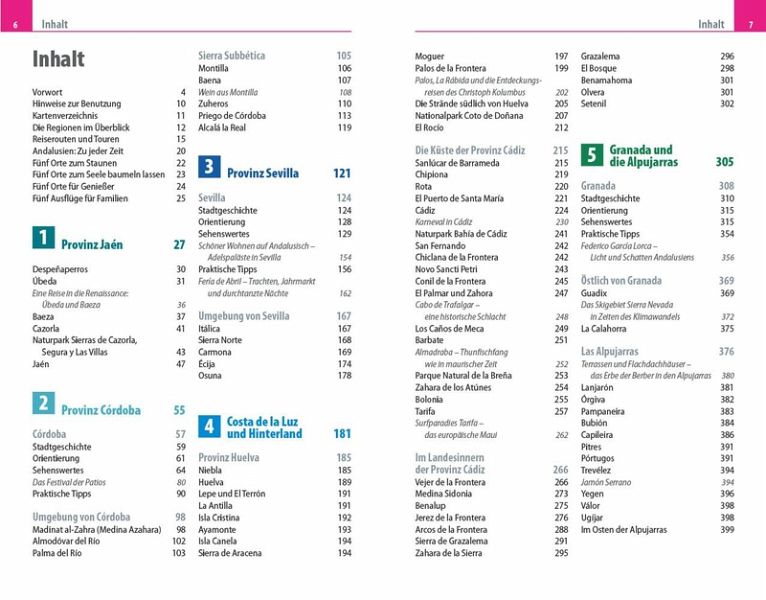 - Umfassende Stadtkapitel zu Granada, Sevilla, Córdoba, Cádiz, und Málaga, besonders gute und typische Restaurants, interessante Shopping-Adressen