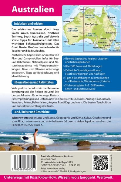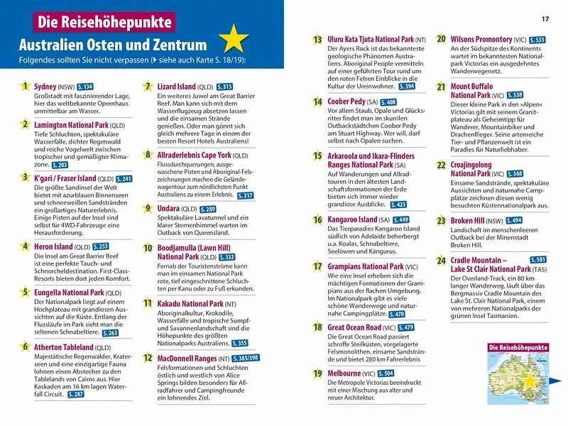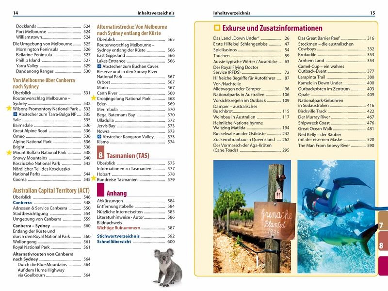 Dieses Buch bietet darüber hinaus fundierte Hintergrundinformationen und unterhaltsame Exkurse zu Land, Kultur und Geschichte rund um das Reiseabenteuer Australien. Es enthält viele praktische Tipps für die Reisevorbereitung, ausführliche Kapitel zum Anmieten von Pkw und Camper, hilfreiche Hinweise für Bus- und Bahnfahrer sowie praktische Hilfestellungen für Tier- und Pflanzenbeobachtungen unterwegs.