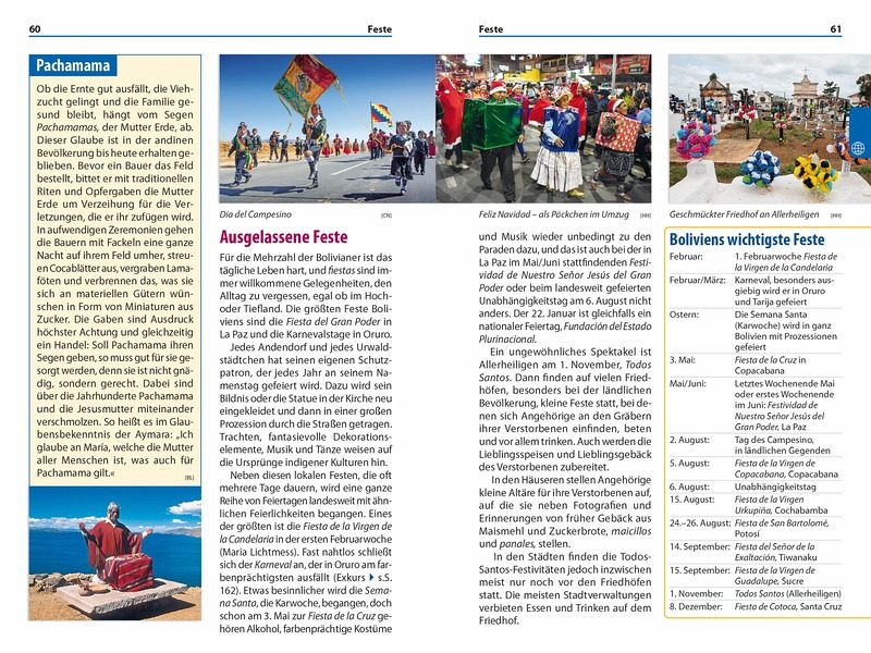 Bolivien fasziniert mit seiner Ursprünglichkeit, mit atemberaubenden Landschaften, einzigartigem Kulturerbe und faszinierender Geschichte. Von den schillernden Lagunen und dem Salar de Uyuni, der größten Salzpfanne der Erde, über den majestätischen Titicacasee bis hin zum unberührten Amazonasbecken - Bolivien überrascht immer wieder aufs Neue. Ob beim Trekking auf Inkapfaden, bei einer Abfahrt mit dem Rad hinab in die Yungas, beim Karneval in Oruro, auf Che-Guevara-Tour, beim Besuch der Silberstadt Potosí oder der einzigartigen Missionskirchen in der Chiquitanía: Die Möglichkeiten, Bolivien zu erleben, sind vielfältig.