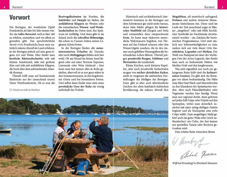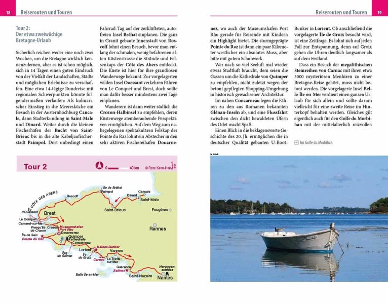 Die Bretagne, der westlichste Zipfel Frankreichs, begeistert Besucher mit herrlichen Küstenabschnitten aus feinem Sand, grobem Kies und zerklüfteten Klippen, die hoch über dem anbrandenden Atlantik thronen. Unzählige Schlösser, Burgen und Herrensitze prägen die Landschaft. Kleine Kirchen und prunkvolle Kathedralen zeugen von der reichen christlichen Kultur der Region. Darüber hinaus gibt es Zeichen der alten heidnisch-keltischen Bevölkerung zu entdecken, die nahezu überall ihre oft meterhoch aufragenden Megalithen, Dolmen und andere steinerne Monumente hinterlassen hat. Kulinarisch präsentiert sich die Bretagne bodenständig, Fisch und Meeresfrüchte gehören allerorts auf die Speisekarten.