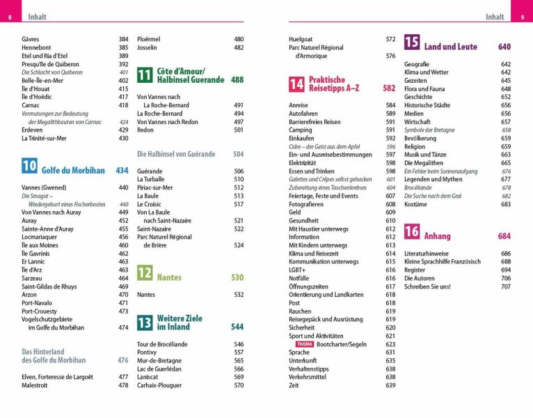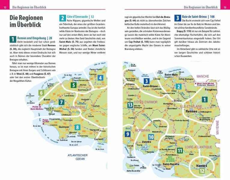- Übersichtsseiten mit Beschreibungen aller Regionen: Rennes, Côte d'Emeraude, Baie de Saint-Brieuc, Côte de Granit Rose, die Bucht von Rose, Côte du Léon, Côte des Abers, die Bucht von Brest, Côte de Cornouaille, Côte des Mégalithes, Golfe du Morbihan, Côte d'Amour