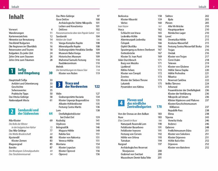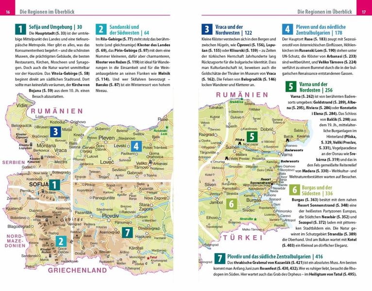 - Übersichtsseiten mit Beschreibungen aller Regionen: Von Sofija und Umgebung über Sandanski und den Südwesten, Vraca und den Nordwesten, Pleven und das nördliche Zentralbulgarien, Varna und den Nordosten, Burgas und den Südosten bis nach Plodiv und ins südliche Zentralbulgarien