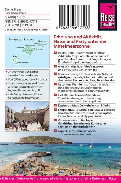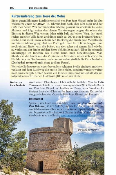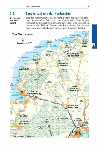 - Beschreibungen aller Städte, Regionen und Strände Ibizas: Eivissa (Ibiza-Stadt), Santa Eulària des Riu und der Osten, der Inselnorden mit Port Sant Miquel und Portinatx, der Nordwesten mit Sant Antoni, der Südwesten mit Sant Josep de Sa Talaia (San José) und der äußerste Süden