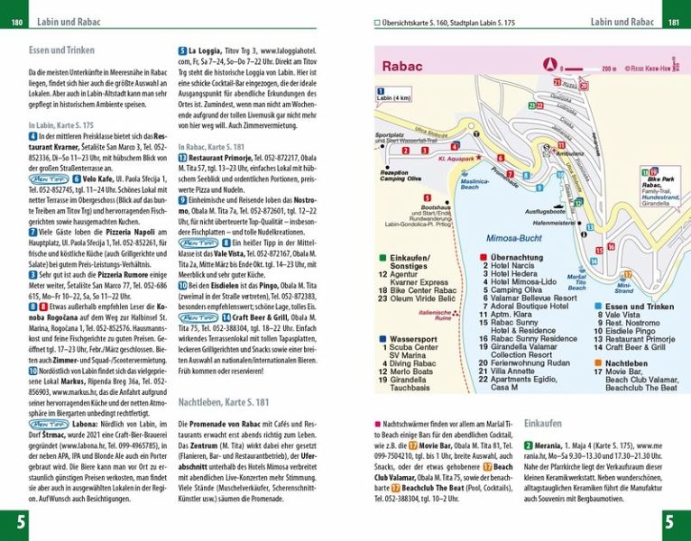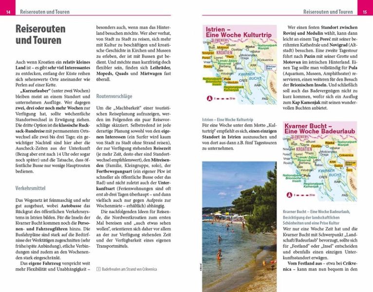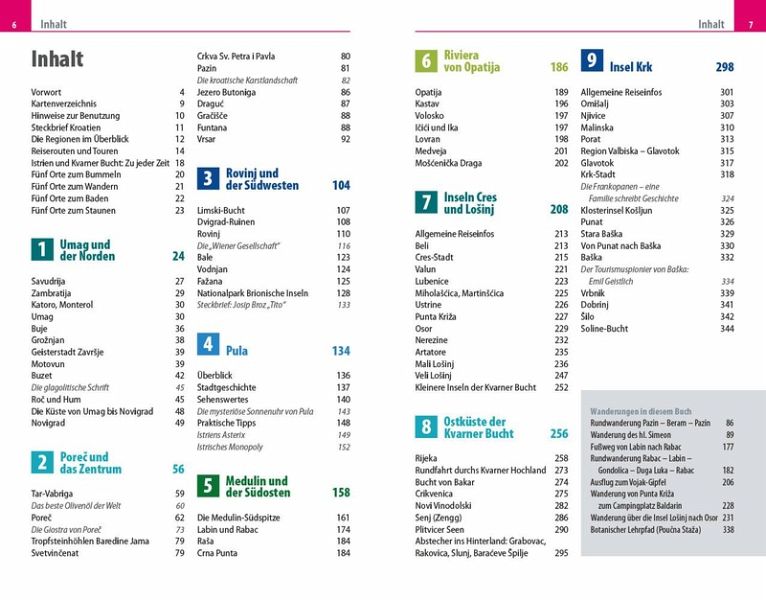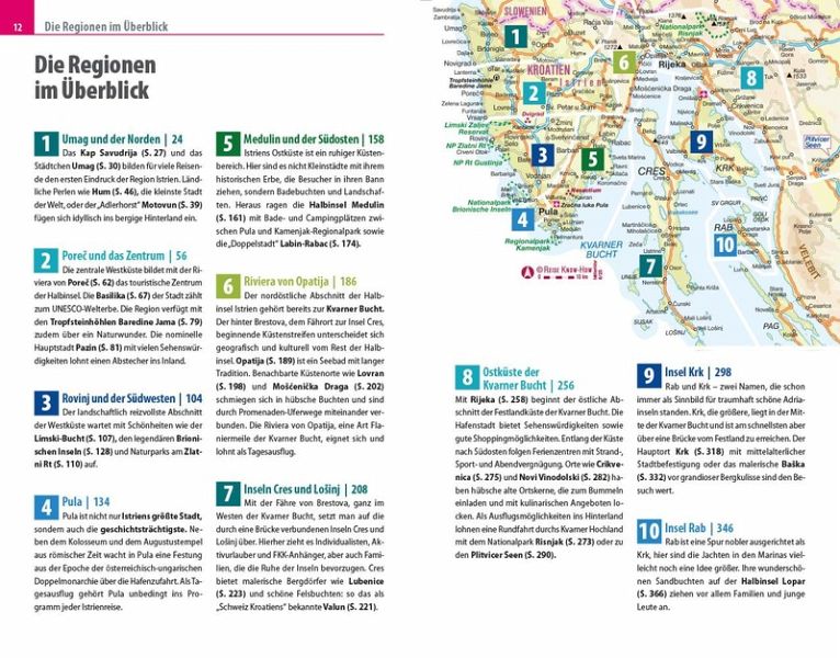 - Übersichtsseiten mit Beschreibungen aller Regionen: Umag und der Norden, Porec und das Zentrum, Rovinj und der Südwesten, Pula, Medulin und der Südosten, Riviera von Opatija, Inseln Cres und Losinj, Ostküste der Kvarner Bucht, Insel Krk und Rab