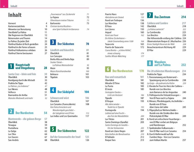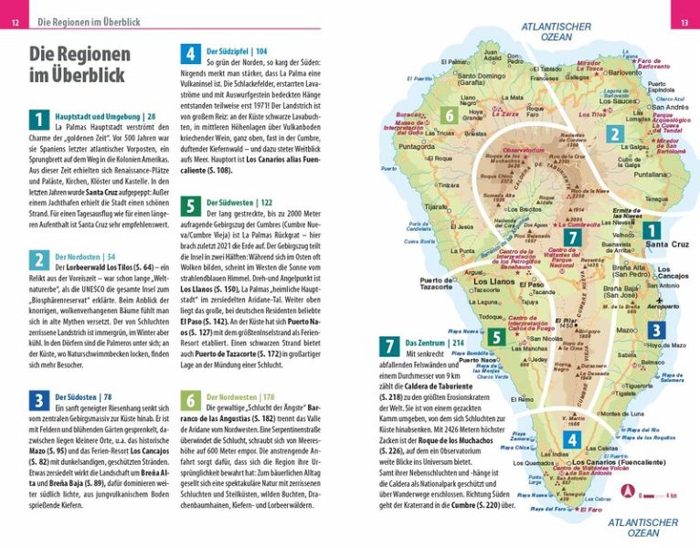 - Übersichtsseiten mit Beschreibungen aller Regionen: Santa Cruz & Umgebung, der Nordosten, der Südosten, der Südzipfel, der Südwesten, das Zentrum mit Caldera und Cumbre