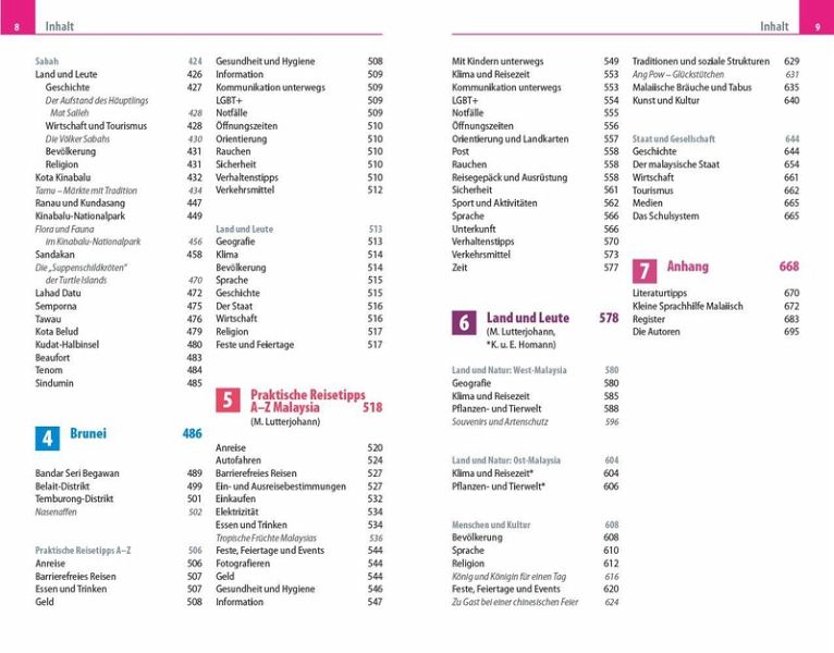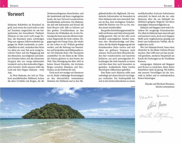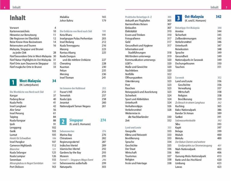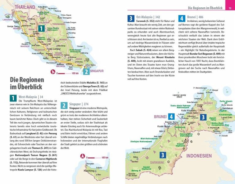 - Übersichtsseiten mit den bedeutendsten Regionen im Überblick: Die Westküste Malaysias von Nord nach Süd, Singapur, Ost-Malaysia und Brunei