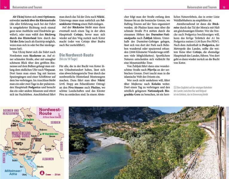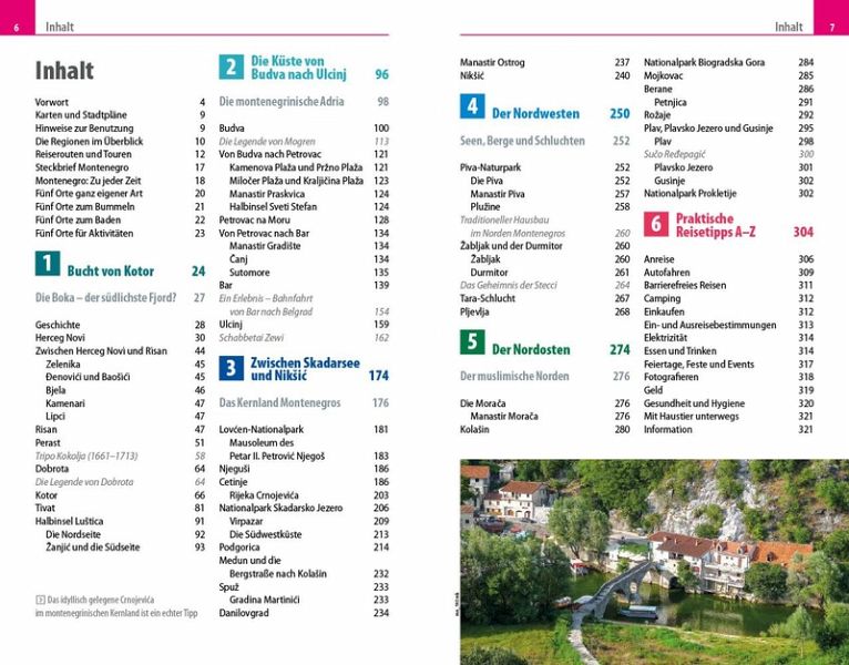 - Übersichtsseiten mit Beschreibungen aller Regionen: Bucht von Kotor, Küste von Budva nach Ulcinj, zwischen Skardarsee & Niksic, der Nordwesten mit seinen Seen, Bergen & Schluchten, der Nordosten Montenegros
