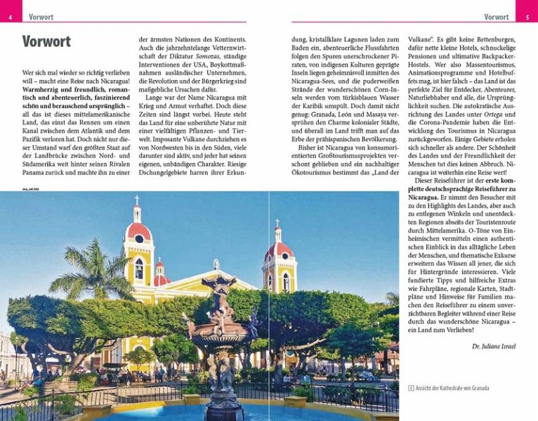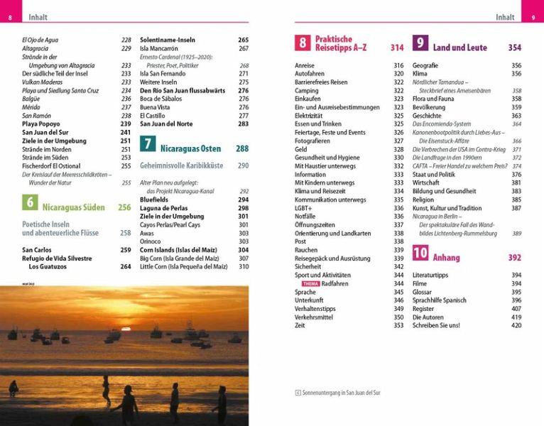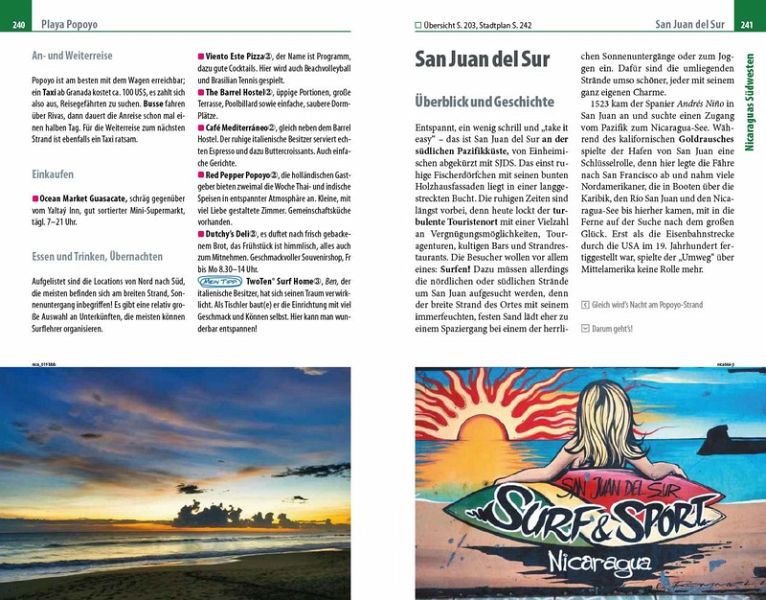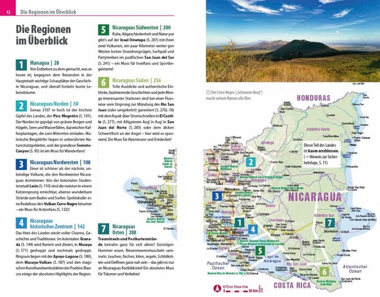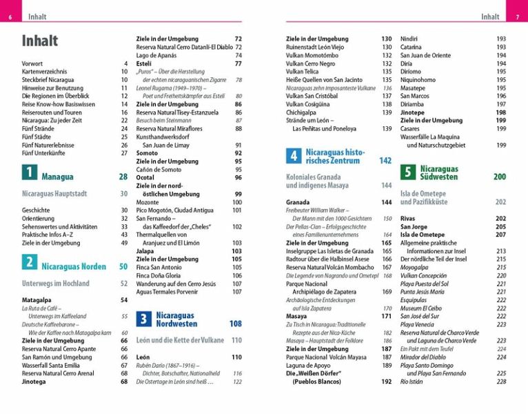 - Übersichtsseiten mit Beschreibungen aller Regionen: Managua, Nicaraguas Hochland im Norden, León und die Kette der Vulkane, Granada und Masaya, Isla de Ometeepe und Pazifikküste, Nicaraguas Süden mit seinen poetischen Inseln und abenteuerlichen Flüssen