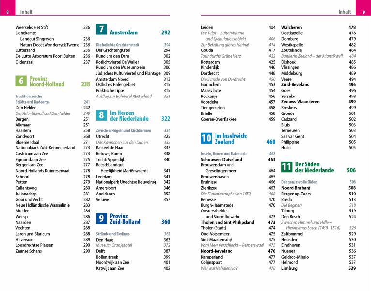 - Übersichtsseiten mit Beschreibungen aller Regionen: Die Nordseeinseln: Texel, Vlieland, Terschelling, Ameland & Schiermonnikoog, der Norden der Niederlande: Friesland, Groningen & Drenthe, Ijssel- und Markermeer, die Hansestäste, der Osten der Niederlande mit Achterhoek & Twente, die Provinz Noord-Holland, Amsterdam, im Herzen der Niederlande, die Provinz Zuid-Holland, Zeeland, der Süden der Niederlande
